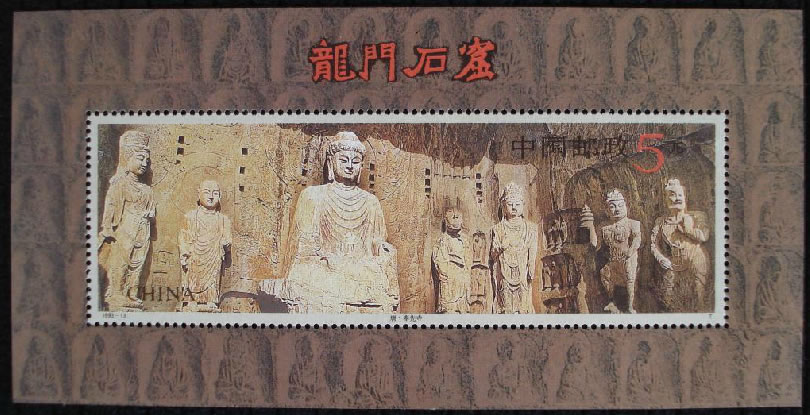 1993 1993-13 Longmen Grottoes The Longmen Grottoes (simplified Chinese: 龙门石窟; traditional Chinese: 龍門石窟; pinyin: lóngmén shíkū; lit. Dragon's Gate Grottoes) or Longmen Caves are one of the finest examples of Chinese Buddhist art. Housing tens of thousands of statues of Buddha and his disciples, they are located 12 kilometres (7.5 mi) south of present day Luòyáng in Hénán province, Peoples Republic of China. The images, many once painted, were carved into caves excavated from the limestone cliffs of the Xiangshan and Longmenshan mountains, running east and west. There are as many as 100,000 statues within the 1,400 caves, ranging from an 1 inch (25 mm) to 57 feet (17 m) in height. The area also contains nearly 2,500 stelae and inscriptions, whence the name “Forest of Ancient Stelae", as well as over sixty Buddhist pagodas.