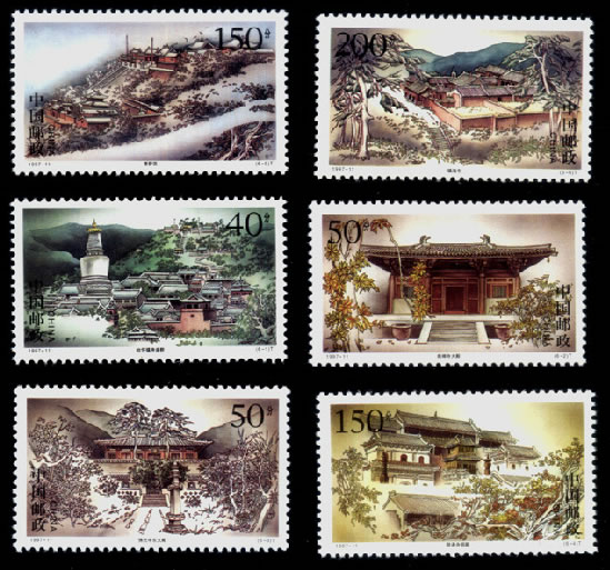 1997 1997-11 Ancient Temples in Wutai Mountain Mount Wutai (Chinese: 五台山; pinyin: Wǔtái Shān; literally: "Five Plateau Mountain"), also known as Wutai Mountain or Qingliang Shan, is a Buddhist sacred site located at the headwaters of river Qingshui, in the Chinese northeastern province of Shanxi, surrounded by a cluster of flat-topped peaks (North, South, East, West, and Central). The North peak, called Beitai Ding or Yedou Feng, is the highest (3.061 m), and indeed the highest point in northern China.The site is home to many of China's most important monasteries and temples. Mount Wutai host over 53 sacred monasteries, and they were inscribed as a UNESCO World Heritage Site in 2009. |