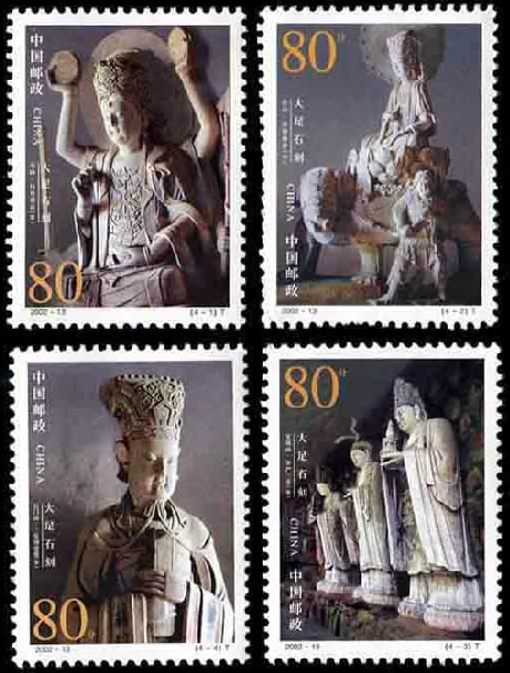 2002 2002-13 Dazu Stone Carvings The Dazu Rock Carvings (Chinese: 大足石刻; pinyin: Dàzú Shíkè) are a series of Chinese religious sculptures and carvings, dating back as far as the 7th century AD, depicting and influenced by Buddhist, Confucian and Taoist beliefs. Listed as a World Heritage Site, the Dazu Rock Carvings are made up of 75 protected sites containing some 50,000 statues, with over 100,000 Chinese characters forming inscriptions and epigraphs. The sites are located in Chongqing Municipality within the steep hillsides throughout Dazu County, located about 60 kilometers west of the urban area of Chongqing. The highlights of the rock grotto are found on Mount Baoding and Mount Beishan.The carvings were listed as a World Heritage Site in 1999. |