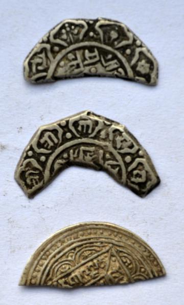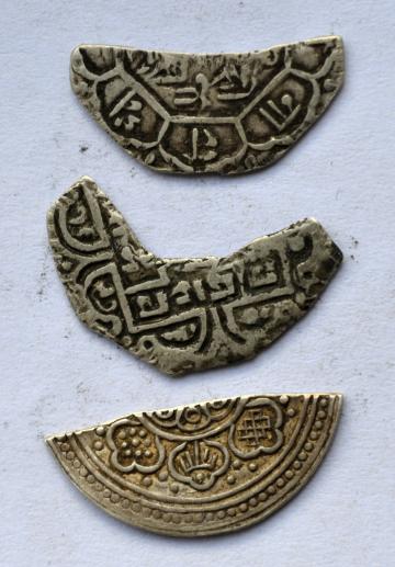 3 different cut coins: 4 petals (7,5 Kar) of Kingdom of Bhatgaon, Jaya Prakash Malla , year 873 (1753), KM#259 5 petals (1 Sho) of Nepal Mohar, Shah Dynasty, Pratap Simha, KM#472.2. 3 petals (5 Kar) of Kelsang Tamka KM Y#14 60,00 EUR