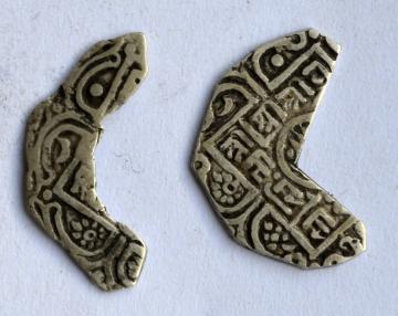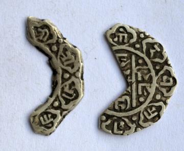 2 cut coins of Mohar Shah Dynasty, Pratap Simha, KM#472.2. 4 petals (7,5 Kar) and 5 petals (1 Sho) in very nice condition. 20,00