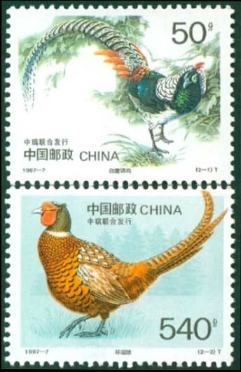 1997 1997-7, Rare birds Chinese Copper Pheasant, Chrysolophus amherstiae, also Lady Amhersts pheasant Common Pheasant, or Ring-necked Pheasant, Phasianus colchicus |