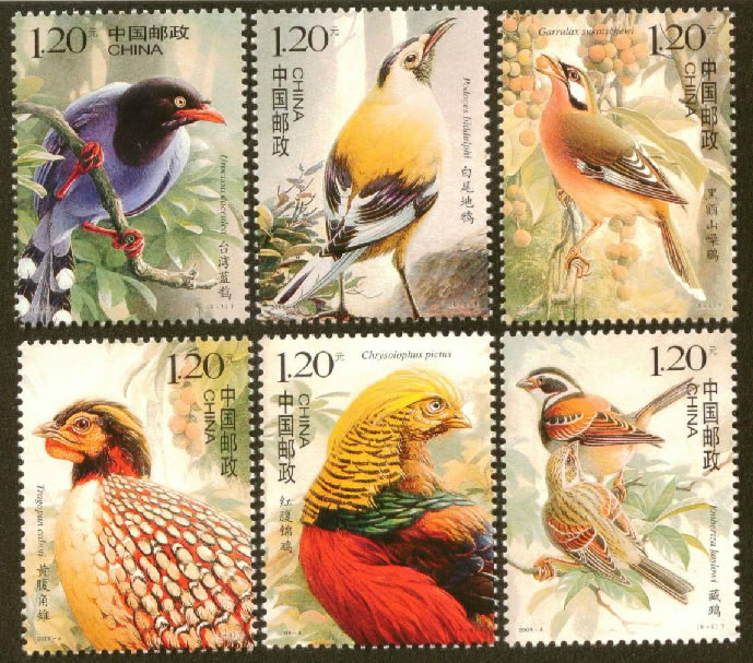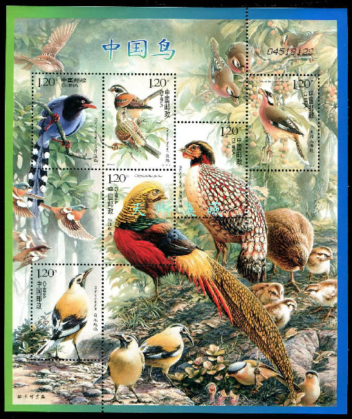 2008 2008-4, Birds of China, sheet Taiwan Blue Magpie, Urocissa caerulea Tibetan Bunting, Emberiza koslowi Cabot's Tragopan, Tragopan caboti Snowy-cheeked Laughingthrush, Garrulax sukatschewi Golden Pheasant, Chrysolophus pictus Biddulph's Ground Jay, Podoces biddulphi |